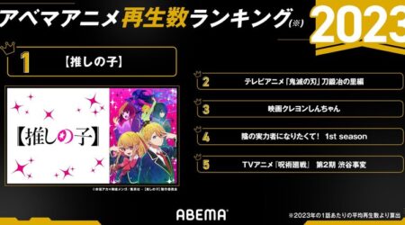 2023/07/21 anime アニメ 【推しの子】ABEMAで歴代最多の視聴者数を記録 春アニメランキング発表で2位は鬼滅の刃 ABEMAは、アニメチャンネルにて放送された4月クールの新作アニメを対象とした視聴データ最終ランキングを発表した。 続きを読む ≫ ランキング 視聴者 アニメ 推しの子 ABEMA コチラのニュースも合わせて読まれています 2023年春アニメ“最終”ランキング1位は『【推しの子】』ABEMA歴代アニメ作品No.1の視聴者数に 2023年アニメジャンル年間再生数ランキング、『【推しの子】』が首位に輝く ABEMA、1週間のアニメ累計視聴者数が開局史上の”最高数値”を更新!『【推しの子】』『〈物語〉シリーズ』リアタイ再生などが貢献
