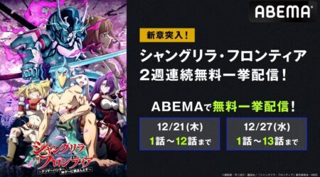2024/02/05 anime アニメ アニメ『シャングリラ・フロンティア』最新話まで全話の無料一挙放送が決定!2月11日&12日の2日間 ABEMAは『シャングリラ・フロンティア』最新話まで全話を、2月11日(日)と12日(月・祝)に無料一挙放送する。 続きを読む ≫ アニメ 無料 漫画 クソゲー 少年 コチラのニュースも合わせて読まれています アニメ『シャングリラ・フロンティア』ABEMAで最新話までの無料一挙放送が決定 アニメ『シャングリラ・フロンティア』『豚のレバーは加熱しろ』など人気異世界・ファンタジーアニメ8作品の振り返り無料一挙放送が決定 「剣と魔法のログレス いにしえの女神」にサンラクたちが登場!アニメ「シャングリラ・フロンティア」とのコラボが4月10日より実施