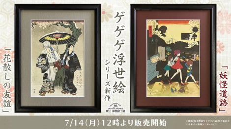 アニメ『ゲゲゲの鬼太郎』の浮世絵シリーズの新作となる2作品が、14日より販売されることが決定した。今回は、映画『鬼太郎誕生 ゲゲゲの謎』とのコラボ作品「花散しの友誼」と、『ゲゲゲの鬼太郎』アニメ第6期とのコラボ作品「妖怪道路」の2作品となる。